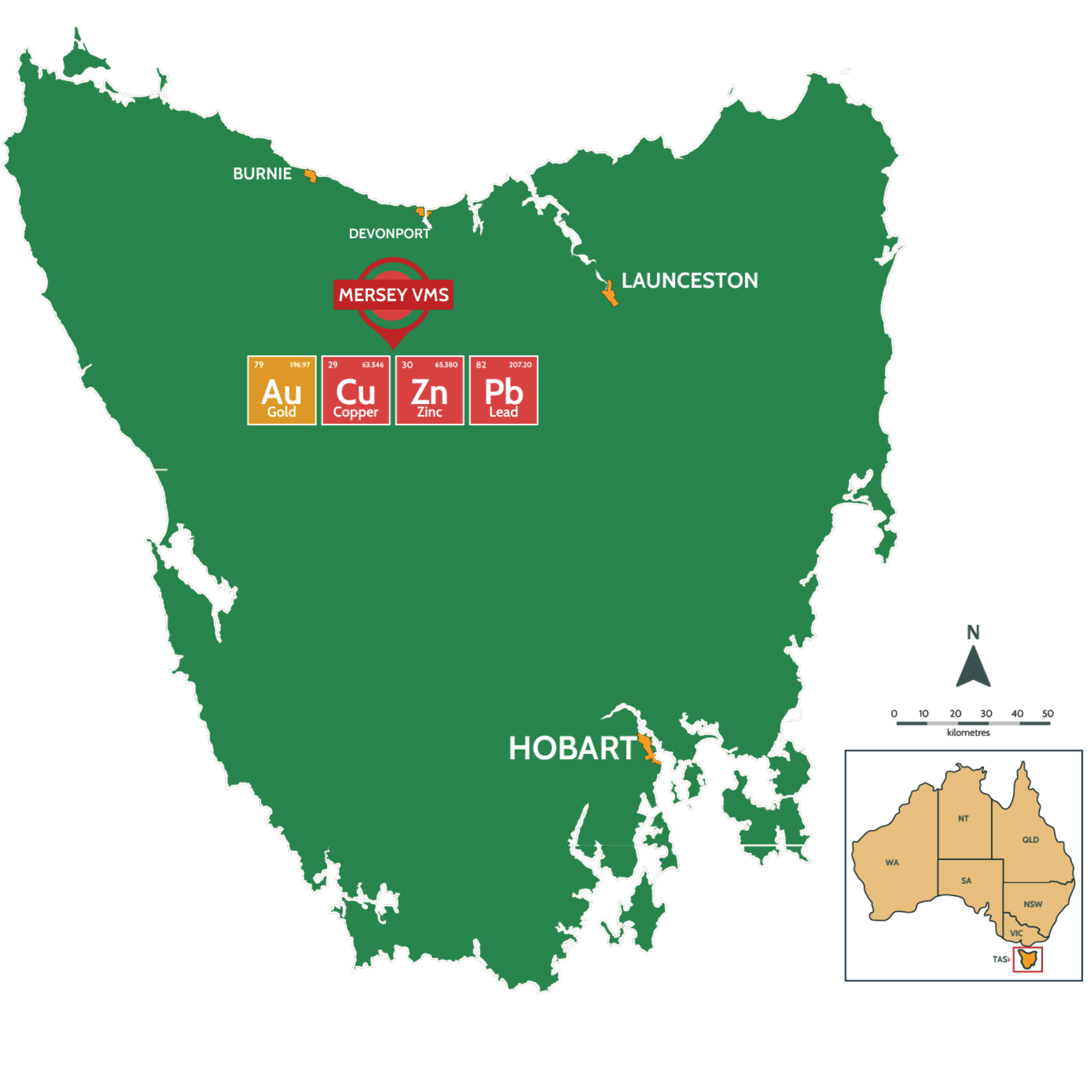 - Mersey VMS Base Metals and Gold Project (Tasmania): situated within an active, world-class volcanogenic massive sulphide belt, targeting copper, lead, zinc and associated gold.
